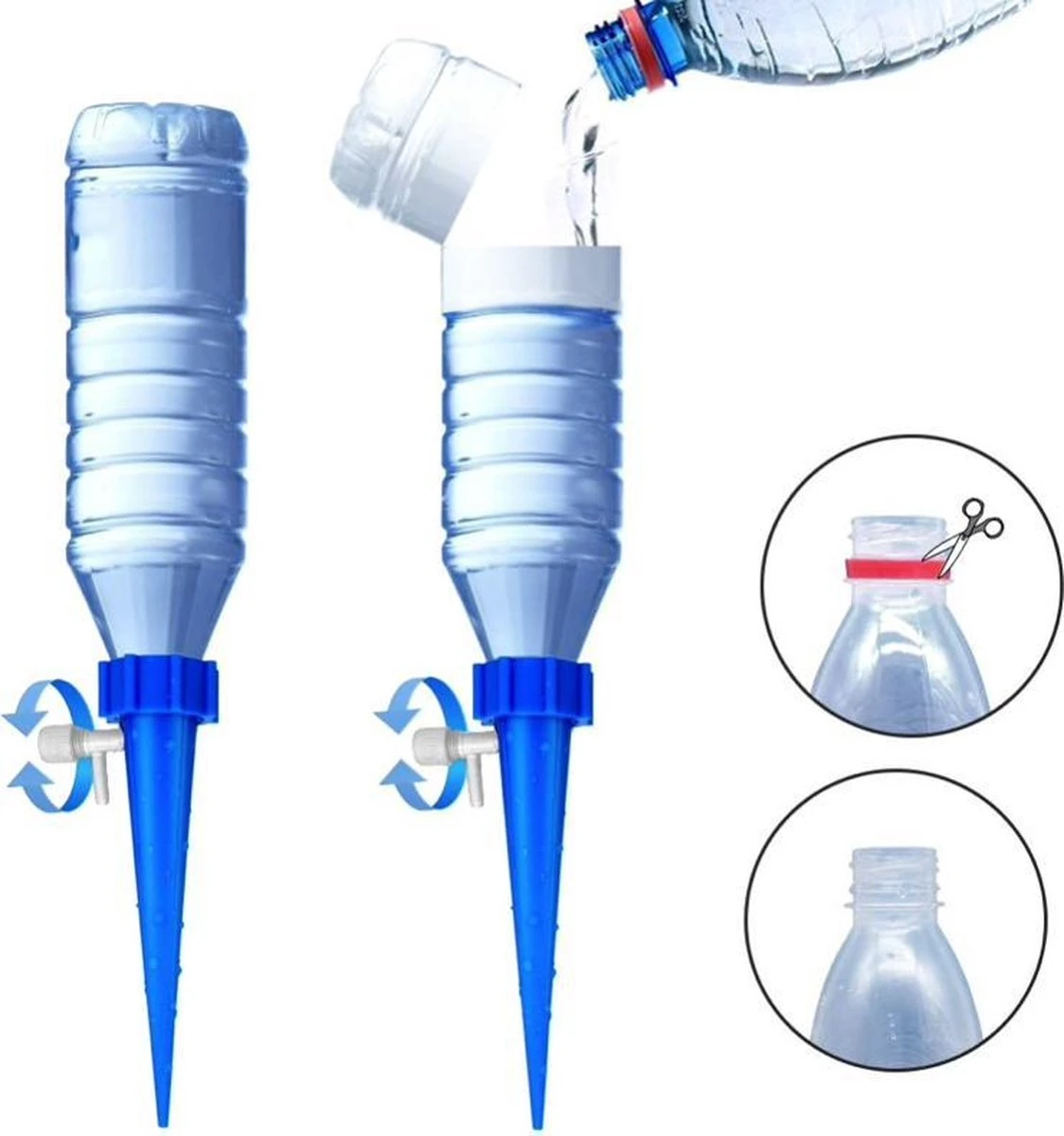 Het wordt je enorm gemakkelijk gemaakt, je vult de fles met water en draait deze op het product. Vervolgens stop je het systeem in de grond en draai je de druppelaar op het gewenste aantal druppels. Past op alle normale grote petflessen!
