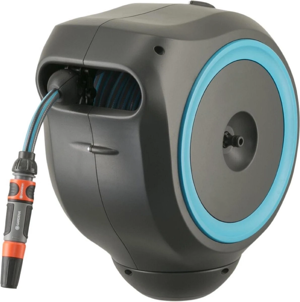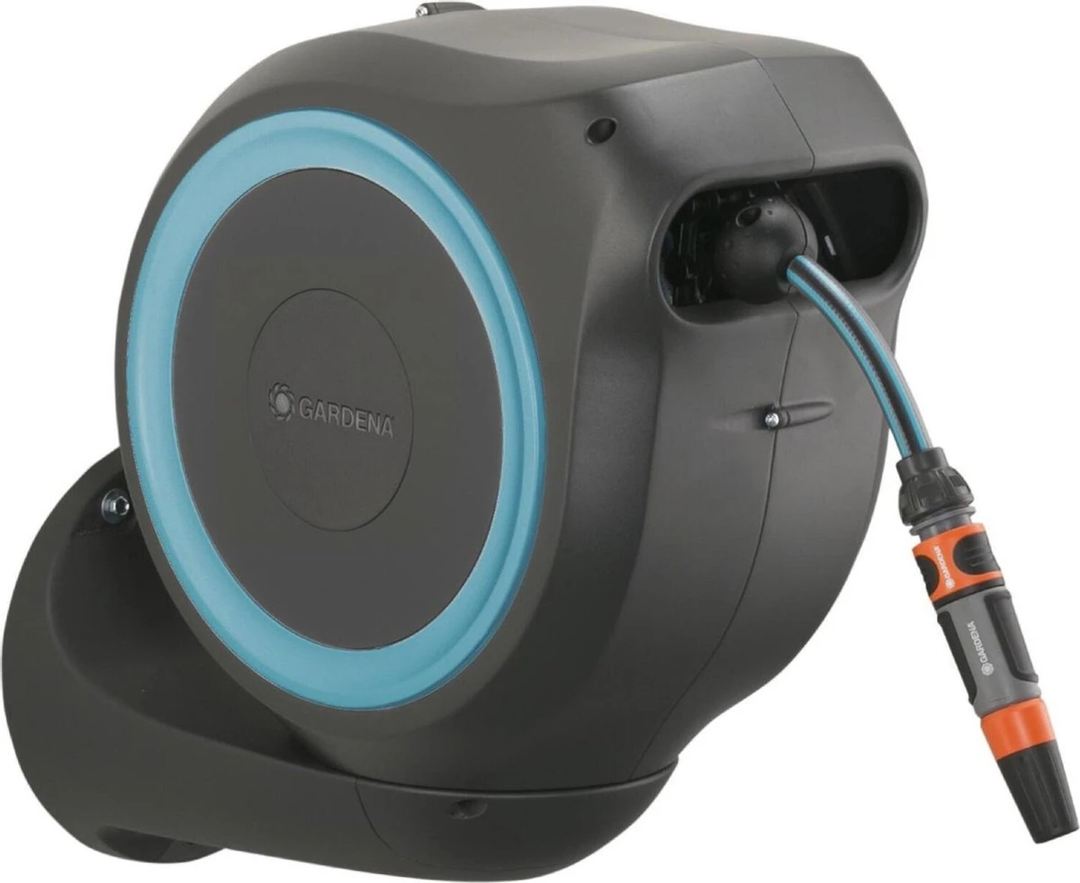 Tuinieren is handiger en gemakkelijker dan ooit met de wandslangenbox RollUp S. Deze helpt uw tuin netjes en opgeruimd te houden en voorkomt hinderlijk struikelgevaar als gevolg van een rondslingerende slang. De praktische slangopslag is eenvoudig aan de muur van uw huis te bevestigen en wordt met een flexibele aansluitslang aangesloten op de kraan. Dankzij de stevige muurbeugel kan de slangenbox meer dan 180 graden worden gedraaid, zodat u elke hoek van uw tuin moeiteloos kunt bereiken. Voor direct gebruik kunt u de tuinslang eenvoudig verlengen tot een lengte van maximaal 15 meter. De tuinslang wordt automatisch in heel korte intervallen vergrendeld zodra u stopt, wat betekent dat de slang eenvoudig en gemakkelijk te hanteren is. Door lichtjes aan het uiteinde van de slang te trekken, wordt de vergrendeling ontgrendeld en een ingebouwde stalen veer met innovatieve RollControl-technologie zorgt voor soepel en gecontroleerd oprollen. De RollControl beschermt de slangenbox en de omgeving tegen schade als gevolg van het te snel inrollen. Om knikken of knopen in de slang te voorkomen, heeft de box een geïntegreerde slanggeleider. Dankzij de slang- en kraanaansluitingen van het Original Gardena System kunt u eenvoudig en flexibel een verlengstuk of ander compatibel Gardena element op de slang aansluiten. U hebt altijd uw Gardena slangopzetstukken bij de hand. Ze kunnen onder de muurbeugel worden bevestigd en daar worden opgeborgen om ruimte te besparen. De Gardena wandslangenbox is UV- en vorstbestendig en kan het hele jaar door probleemloos aan de muur van het huis blijven bevestigd. Het hoogwaardige materiaal biedt u een lange levensduur en gebruiksgemak zonder onderhoud. Samen met de wandslangenbox ontvangt u een muurbeugel, een flexibele aansluitslang, alle benodigde Original Gardena System en montageonderdelen en een mondstuk met twee verschillende sproeiopties. Dit hoogwaardige product wordt geleverd met een garantie van vijf jaar van Gardena. Bewatering die altijd gebruiksklaar is , dankzij de Gardena wandslangenbox RollUp S.