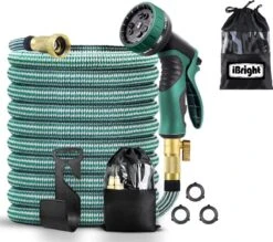 IBright Extra Sterke Uitrekbare Tuinslang – Flexibel – 15 Meter – Inclusief Opbergtas ,Sproeier ,Koppelstuk En Ophanghaak – Groen